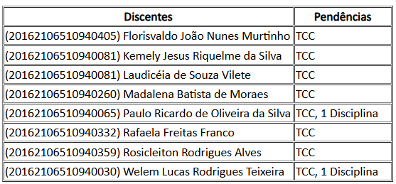 Desta forma, os alunos com pendências seguem listados a seguir: