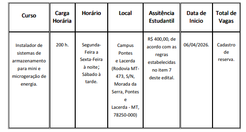 O Instituto Federal de Mato Grosso Campus Pontes e Lacerda publicou o Edital nº 19/2026, que trata de uma chamada pública para matrícula no curso de Formação Inicial e Continuada (FIC) de Instalador de Sistemas de Armazenamento para Mini e Microgeração de Energia, ofertado pelo programa Qualifica Mais EnergIFE.