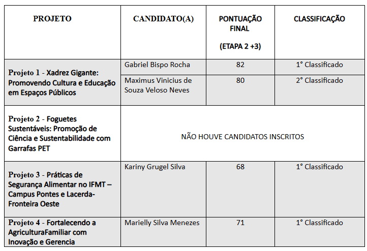 O Instituto Federal de Educação, Ciência e Tecnologia de Mato Grosso (IFMT) – Campus Pontes e Lacerda – Fronteira Oeste divulga o resultado do final do Processo Seletivo Simplificado (Edital 23/2025) para a formação de Cadastro de Reserva de estudantes bolsistas. O objetivo é selecionar alunos para atuar em quatro projetos de extensão já aprovados, vinculados aos editais nº 150 e 152/2024.