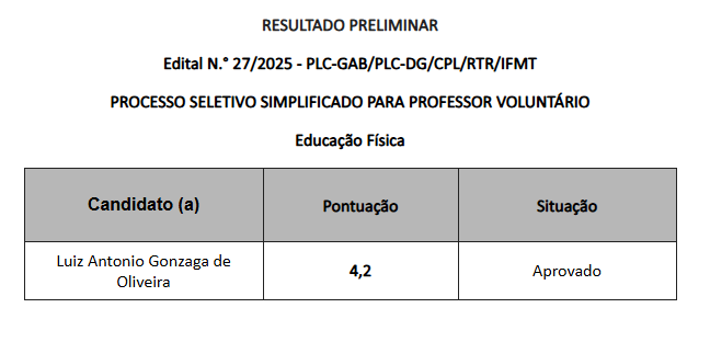 O Instituto Federal de Mato Grosso Campus Pontes e Lacerda – publicou o resultado preliminar do Edital nº 27/2025, objetivando o processo seletivo simplificado para a contratação de professor voluntário na área de Educação Física, destinado aos cursos Técnicos em Administração, Controle Ambiental e Informática Integrados ao Ensino Médio.